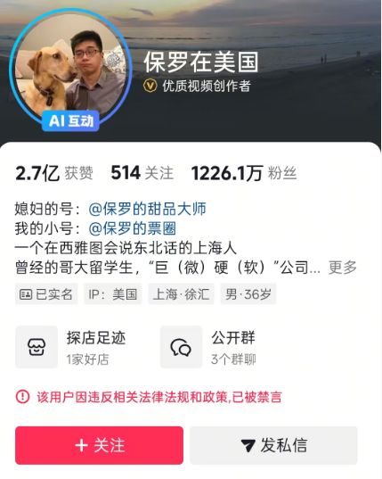 2月11日下午,因晒妻子生产过程视频被质疑的千万粉丝博主“保罗在美国”已被平台禁言,其抖音账号主页显示,该用户因违反相关法律法规和政策,已被禁言。