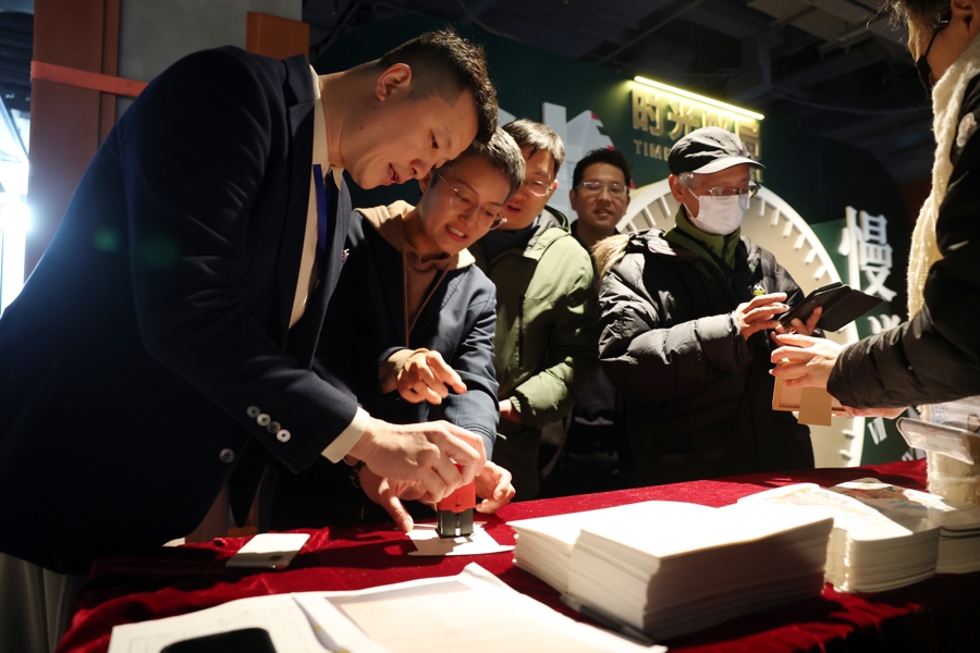 市民在新亮相的上海市历史博物馆邮局加盖纪念邮戳。