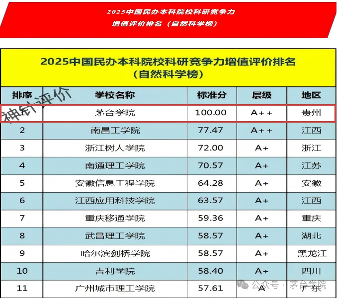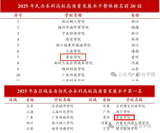 6月27日,苏州大学民办教育研究中心(SU-PERI)发布《2025年民办本科高校高质量发展评价》。评价结果显示:2025年全国民办本科高校高质量发展水平整体排名榜,茅台学院位于第7名;2025年各区域各省份民办本科高校高质量发展水平第一名榜单中,茅台学院跃居贵州民办本科高校第一。
