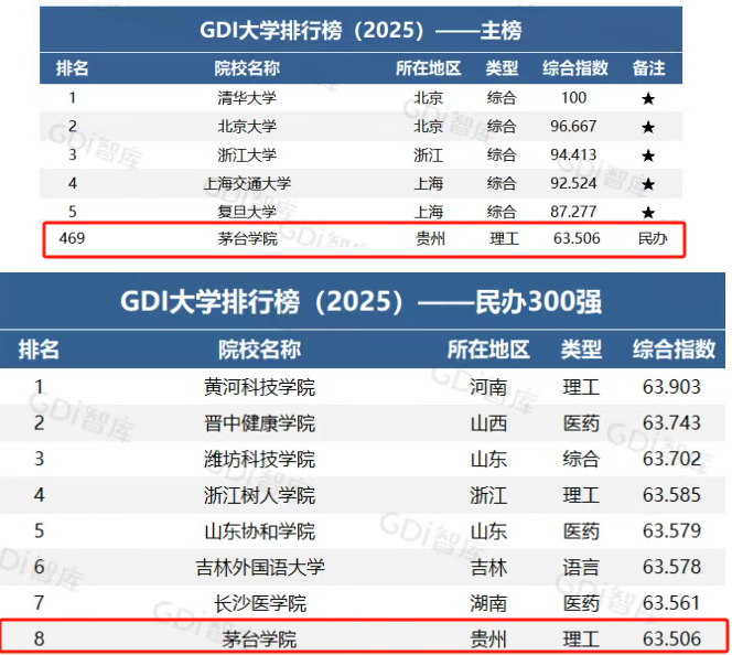 4月16日,广州日报数字化研究院(GDI智库)发布“2025年GDI大学排行榜”。在GDI大学排行榜主榜中,茅台学院排名在500名以内;GDI大学排行榜民办高校中,位列第8名;