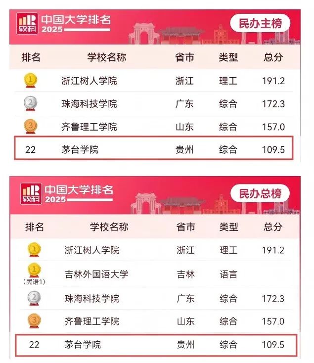4月15日,软科发布“2025软科中国大学排名”,茅台学院在全国民办高校中排名第22位,稳居贵州省首位;