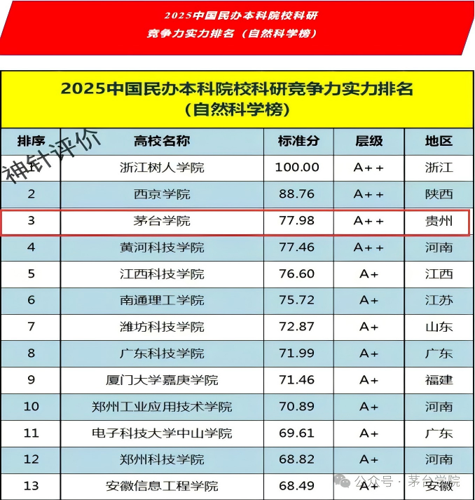 6月9日,神针评价(SZPJ)发布科研能力评估结果,茅台学院自然科学科研竞争力增值评价列全国民办高校第一,自然科学综合实力在民办高校中排名第三。