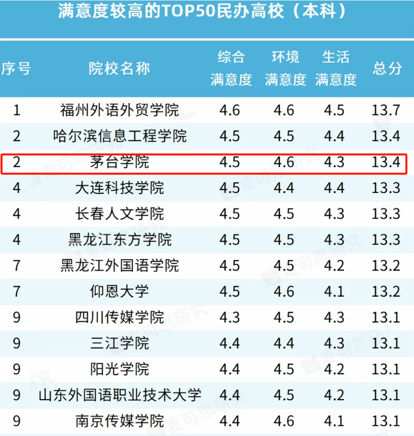 阳光高考网调研数据显示,在满意度较高的TOP50民办高校(本科)中,茅台学院综合满意度达到4.5分,排名与哈尔滨信息工程学院并列第二。