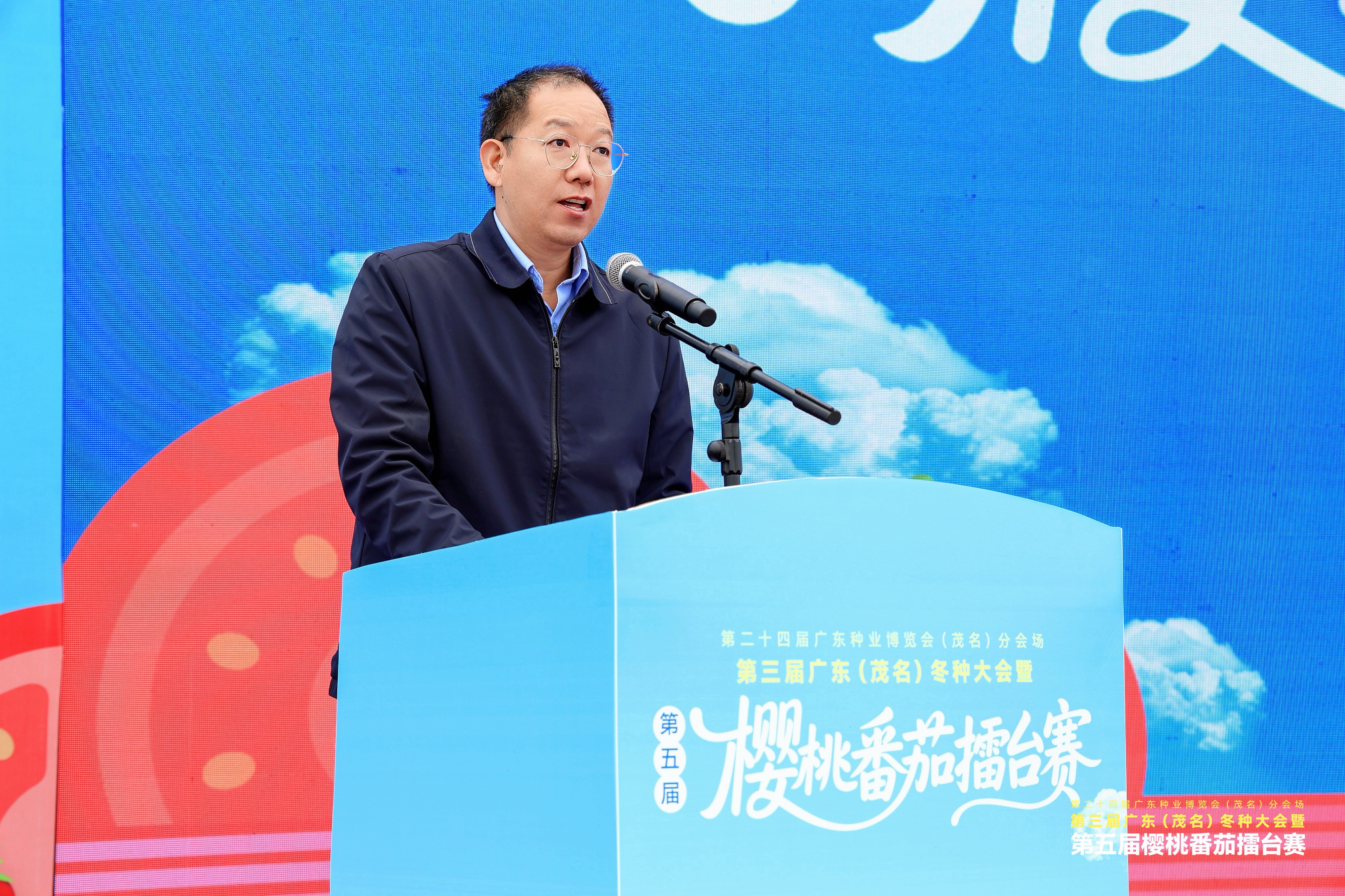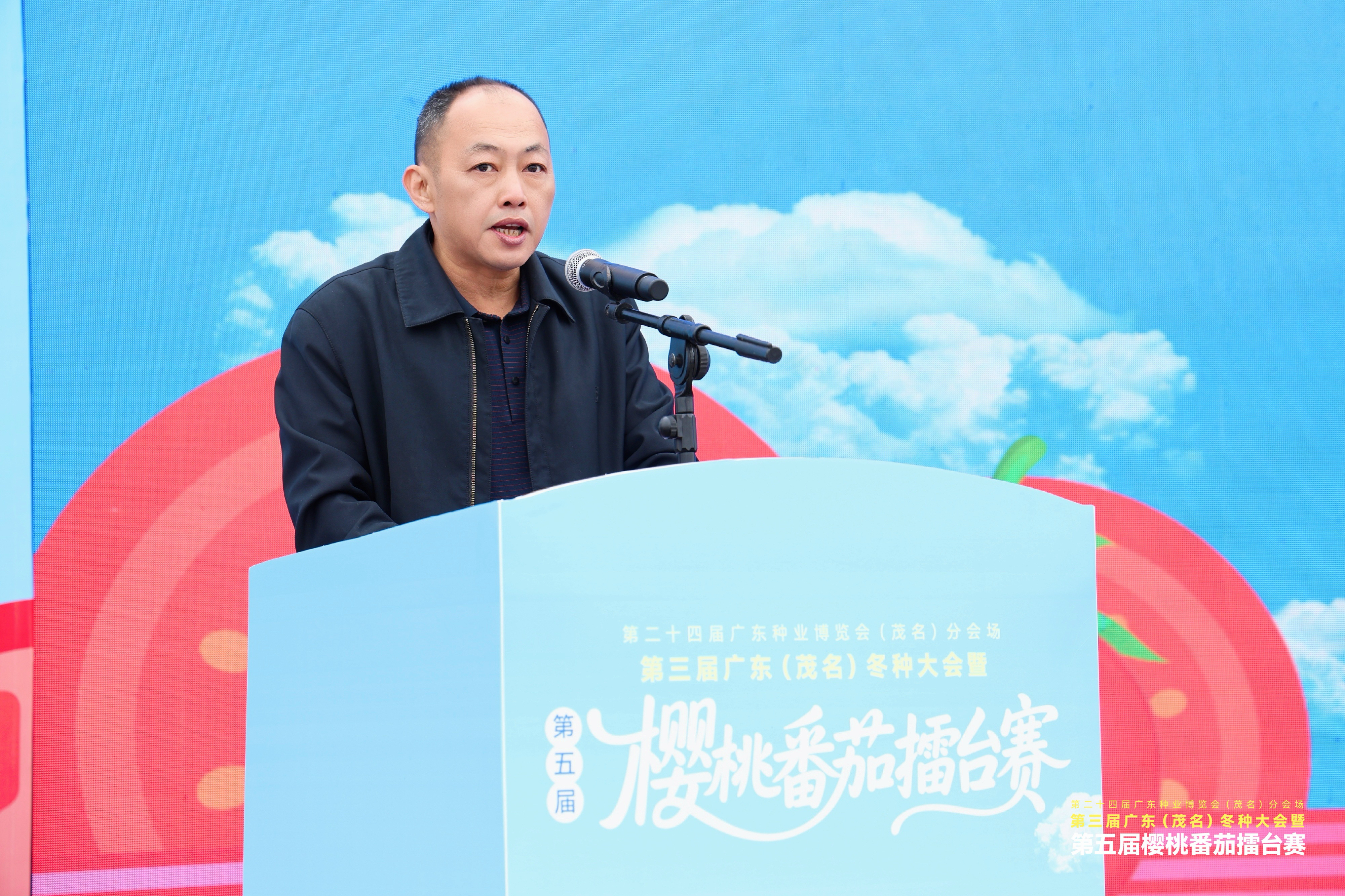 茂名市农业农村局党组成员、副局长高春亮现场致辞。他表示,从早年单一种植辣椒,到如今瓜、菜、薯、樱桃番茄等多品类行销全国,茂名冬种产业已形成规模效应。当前冬种作物总面积达140万亩,其中蔬菜种植面积约96万亩,2025年全市蔬菜总产量超415万吨、总产值超170亿元,水东芥、笪桥黄瓜、樱桃番茄等特色品类享誉全国。