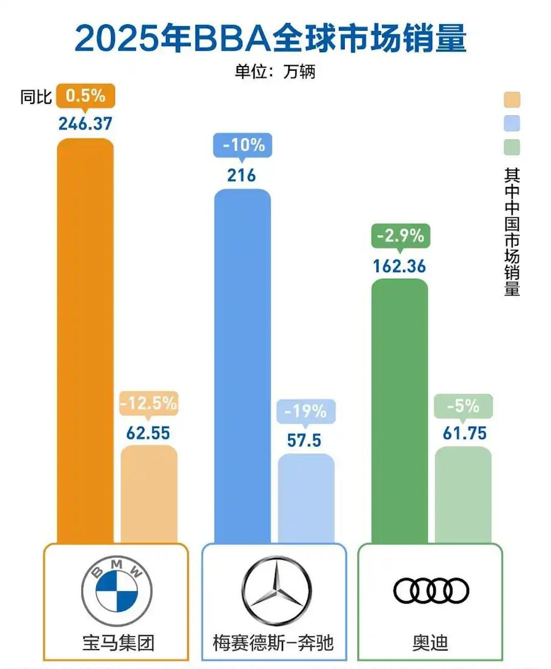 据统计,2025年,BBA在中国市场的纯电车型总销量不足30万辆,而同期蔚来、理想、小米和特斯拉等新品牌的单一品牌销量动辄突破20万辆,差距一目了然。